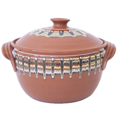 This 6-liter traditional Bulgarian clay pot (gyuvech) features the iconic Trojan Pattern – a symbol of folk craftsmanship and quality. Ideal for slow-cooked stews, roasts, beans, and hearty oven dishes. The ceramic material evenly distributes heat and enhances flavor during cooking.