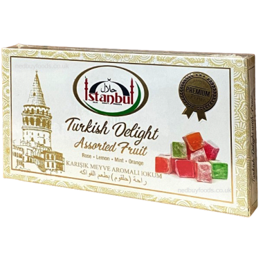 Experience the exotic flavours of Istanbul with our Turkish Delight Assorted Fruit selection, weighing 350g. Handcrafted to perfection, this delightful assortment features the delicate essence of rose, zesty lemon, refreshing mint, and vibrant orange. Each bite offers a burst of fruity sweetness, transporting you to the bustling streets of Turkey with every taste. Ideal for gifting or treating yourself, it's a delightful addition to any dessert spread or afternoon tea. Elevate your snacking experience with the authentic taste of Istanbul's Turkish Delight Assorted Fruit.